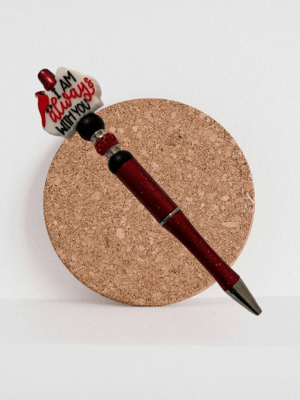 🌹 Keep your loved ones close with this meaningful pen featuring an "I Am Always With You" message topper. The white and red theme with black and ruby-toned beads makes it both sentimental and beautiful. Its premium finish and comforting vibe make it a heartfelt gift.